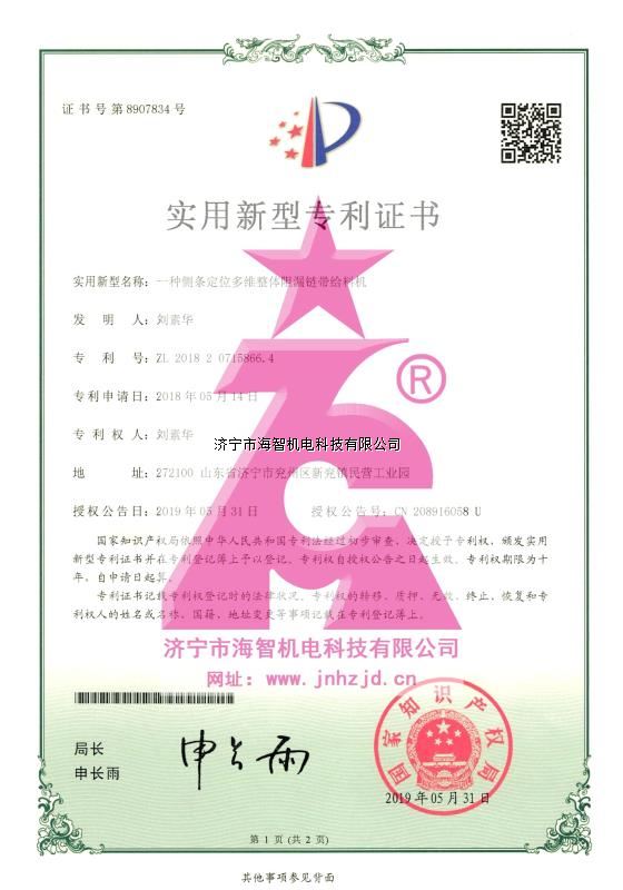1、該機(jī)構(gòu)由膠鏈帶、側(cè)定位條、鏈帶鎖緊件、鏈齒輪驅(qū)動(dòng)件、改向滾筒、清料裝置、驅(qū)動(dòng)總成、導(dǎo)料槽、機(jī)底架等組成,側(cè)定位條設(shè)置于膠鏈帶端部伸出,鏈帶鎖緊件將側(cè)定位條端部鎖在膠鏈帶上形成整體阻漏側(cè)條定位膠鏈帶,膠鏈帶環(huán)扣在鏈齒輪驅(qū)動(dòng)件和改向滾筒上,鏈齒輪驅(qū)動(dòng)件驅(qū)動(dòng)膠鏈帶,帶動(dòng)側(cè)定位條繞鏈齒輪驅(qū)動(dòng)件和改向滾筒循環(huán),側(cè)定位條帶動(dòng)膠鏈帶穩(wěn)定輸送物料;
